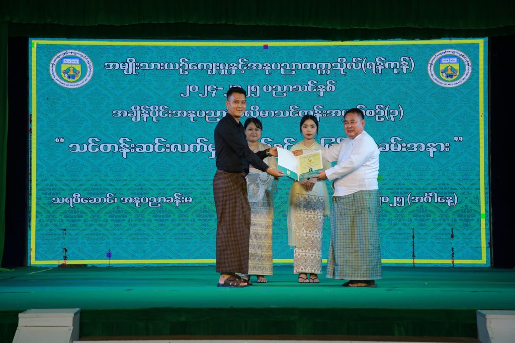 အဆိုပါအခမ်းအနားတွင် အချိန်ပိုင်းအနုပညာဒီပလိုမာ Level – I သင်တန်း၌ သင်တန်းသား၊ သင်တန်းသူ ဂီတပညာဌာနမှ (၆၀) ဦး၊ သဘင်ပညာဌာနမှ (၂၃) ဦး၊ ပန်းချီပညာဌာနမှ (၇၂)ဦး၊ ပန်းပုပညာဌာနမှ (၅)ဦး၊ ယဉ်ကျေးမှုအမွေအနှစ်စီမံခန့်ခွဲမှုပညာဌာနမှ (၉)ဦး၊ စုစုပေါင်း (၁၆၉)ဦး၊ Level-II သင်တန်း၌ သင်တန်းသား၊ သင်တန်းသူ ဂီတပညာဌာနမှ (၁၁)ဦး၊ သဘင်ပညာဌာနမှ (၄)ဦး၊ ပန်းချီပညာဌာနမှ (၃၆)ဦး၊ ပန်းပုပညာဌာနမှ (၃)ဦး၊ ရုပ်ရှင်နှင့်ပြဇာတ် ပညာဌာနမှ (၅)ဦး၊ ယဉ်ကျေးမှုအမွေအနှစ်စီမံခန့်ခွဲမှုပညာဌာနမှ (၈)ဦး၊ အနုပညာကွန်ပျူတာဒီပလိုမာ (၄၃) ဦး၊ စုစုပေါင်း (၆၇)ဦး၊ တို့အား သင်တန်းဆင်းလက်မှတ်များ  အပ်နှင်းချီးမြှင့်ခဲ့ပါသည်။
