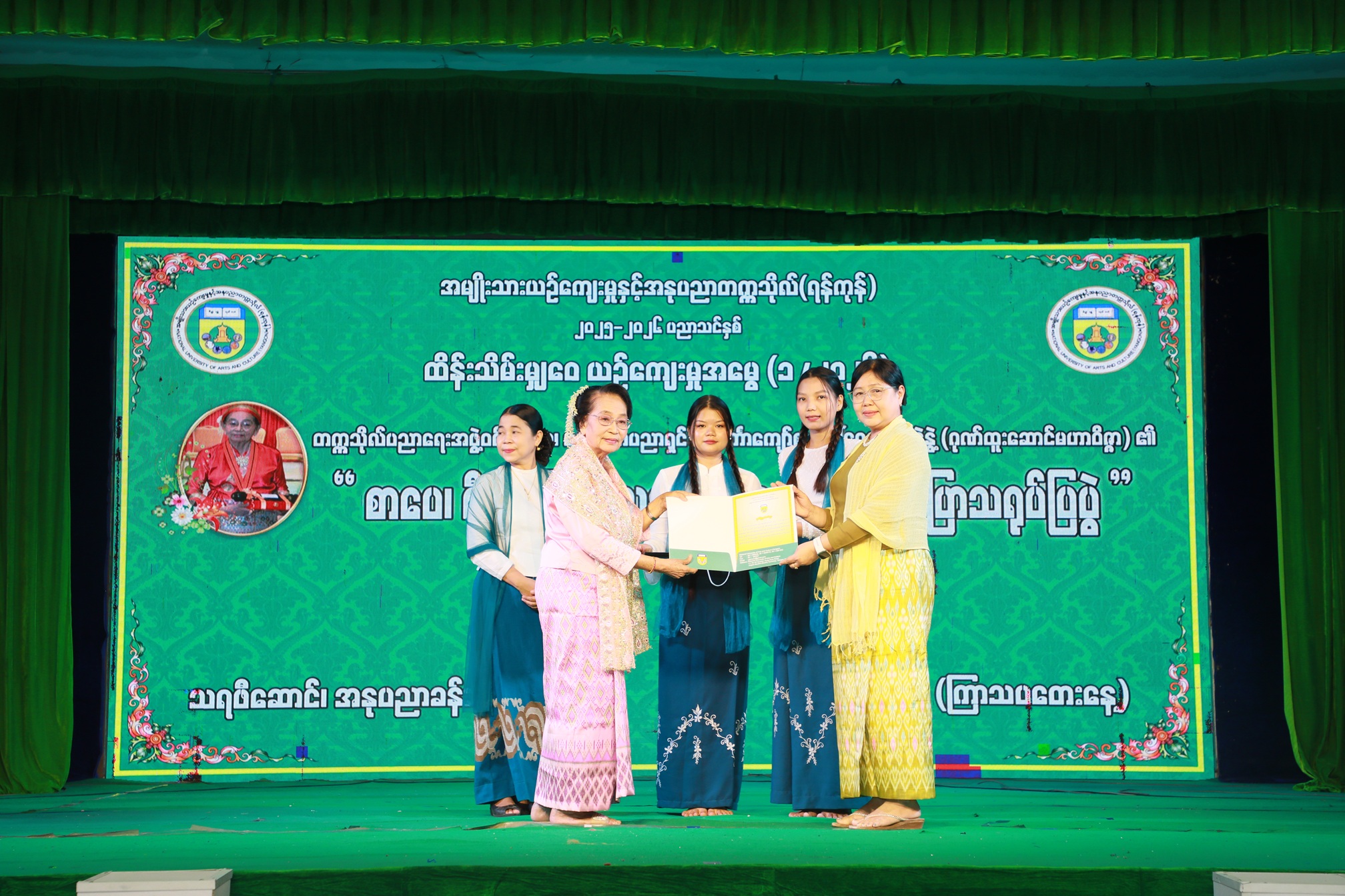 ထို့နောက် အမျိုးသားယဉ်ကျေးမှုနှင့်အနုပညာတက္ကသိုလ်(ရန်ကုန်) ပါမောက္ခချုပ်၊ ဒေါက်တာကေသီထွေးက အလင်္ကာကျော်စွာ ဒေါ်ရွှေကူနန်းနွဲ့နွဲ့ (ဂုဏ်ထူးဆောင်မဟာဝိဇ္ဇာ)အား ဂုဏ်ပြုလက်ဆောင် ပေးအပ်ချီးမြှင့်ပြီး စုပေါင်း မှတ်တမ်းတင်ဓာတ်ပုံရိုက်ကူး၍ အခမ်းအနားကို ရုပ်သိမ်းခဲ့ပါသည်။