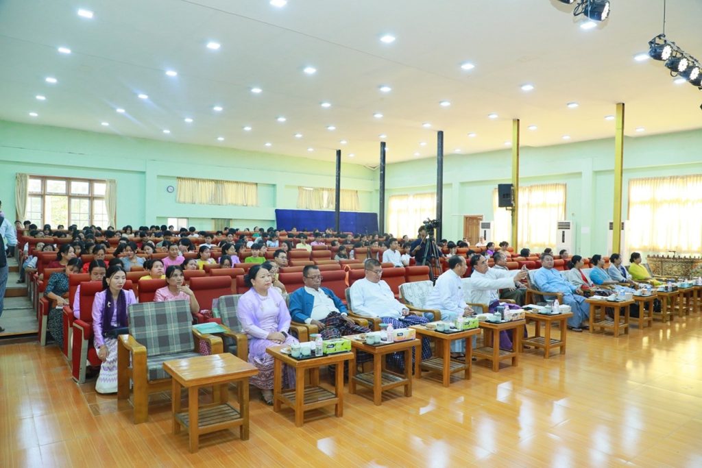 အခမ်းအနားတွင် ဒုတိယပါမောက္ခချုပ်(သင်ကြား)ဦးခိုင်ထွန်းက အဖွင့်အမှာစကား ပြောကြား၍ ပညာရှင် ဦးသန်းမောင်(စစ်တွေ)က ဒြပ်မဲ့ယဉ်ကျေးမှုထိန်းသိမ်း စောင့်ရှောက်ရေး ဥပဒေ ရှုထောင့်နှင့်ပတ်သက်၍ ဟောပြောဆွေးနွေးခဲ့ပါသည်။