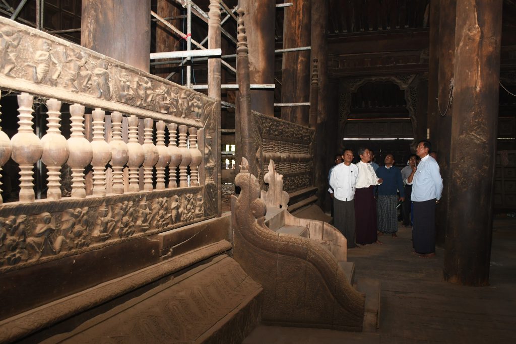 ထို့နောက် ပြည်ထောင်စုဝန်ကြီးသည် မဟာမင်းထင် သစ်သားဘုန်းတော်ကြီးကျောင်း အား မြန်မာနိုင်ငံကုန်သည်များနှင့်စက်မှုလုပ်ငန်းရှင်များအသင်း၏ ညှိနှိုင်းစီစဉ်မှုဖြင့် ဂျပန်နိုင်ငံ ဘက်မှလှူဒါန်းငွေဖြင့် ပြုပြင်နေမှုအခြေအနေများကို သွားရောက်ကြည့်ရှုစစ်ဆေးပြီး ဖြစ်နိုင် သရွေ့ မူလသစ်သားပန်းပုများ ပြန်လည်ရှာဖွေစုဆောင်းတပ်ဆင်ရေး၊ အမိုးအကာများကို ရှေးဟောင်းပုံသဏ္ဌာန်အတိုင်းဆောင်ရွက်ရေး၊ ကြမ်းခင်း၊ ဆင့်များကို အရည်အသွေးကောင်းစွာ သုံးစွဲရေး၊ သစ်သားအဟောင်းများ ရှာဖွေသုံးစွဲရေးနှင့် နောင်ရေရှည်တည်တံ့ခိုင်မြဲရေးတို့အတွက် ကြီးကြပ်စိစစ်ဆောင်ရွက်သွားရန် မှာကြားခဲ့ပါသည်။ မဟာမင်းထင်သစ်သားဘုန်းကြီးကျောင်း သည် အင်းဝခေတ်က စတင်တည်ဆောက်ခဲ့ပြီး ဘိုးတော်ဗဒုံမင်းလက်ထက်တွင် အင်းဝမှ အမရပူရသို့ ပြောင်းရွှေ့တည်ဆောက်ခဲ့ကာ မင်းတုန်းမင်းကြီး ရတနာပုံရွှေနန်းတော် ပြောင်းရွှေ့ စိုးစံရာတွင် ယခုနေရာအား ထပ်မံပြောင်းရွှေ့တည်ဆောက်ခဲ့ရာ နှစ်ပေါင်း(၃၀၀)ခန့် ကြာမြင့်ပြီ ဖြစ်၍ အထူးဂရုပြု ထိန်းသိမ်းရေးဆောင်ရွက်ရန် လမ်းညွှန်မှာကြားခဲ့ပါသည်။